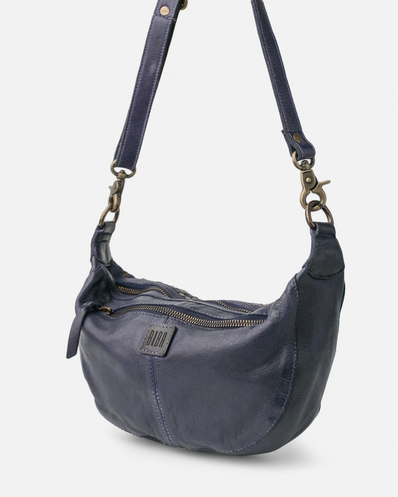 Small, half moon shaped, washed cowhide shoulder bag. Metallic studs on the front. Zipper closure. Removable short shoulder strap, adjustable and removable crossbody shoulder strap. Internal pockets. Cotton lining.