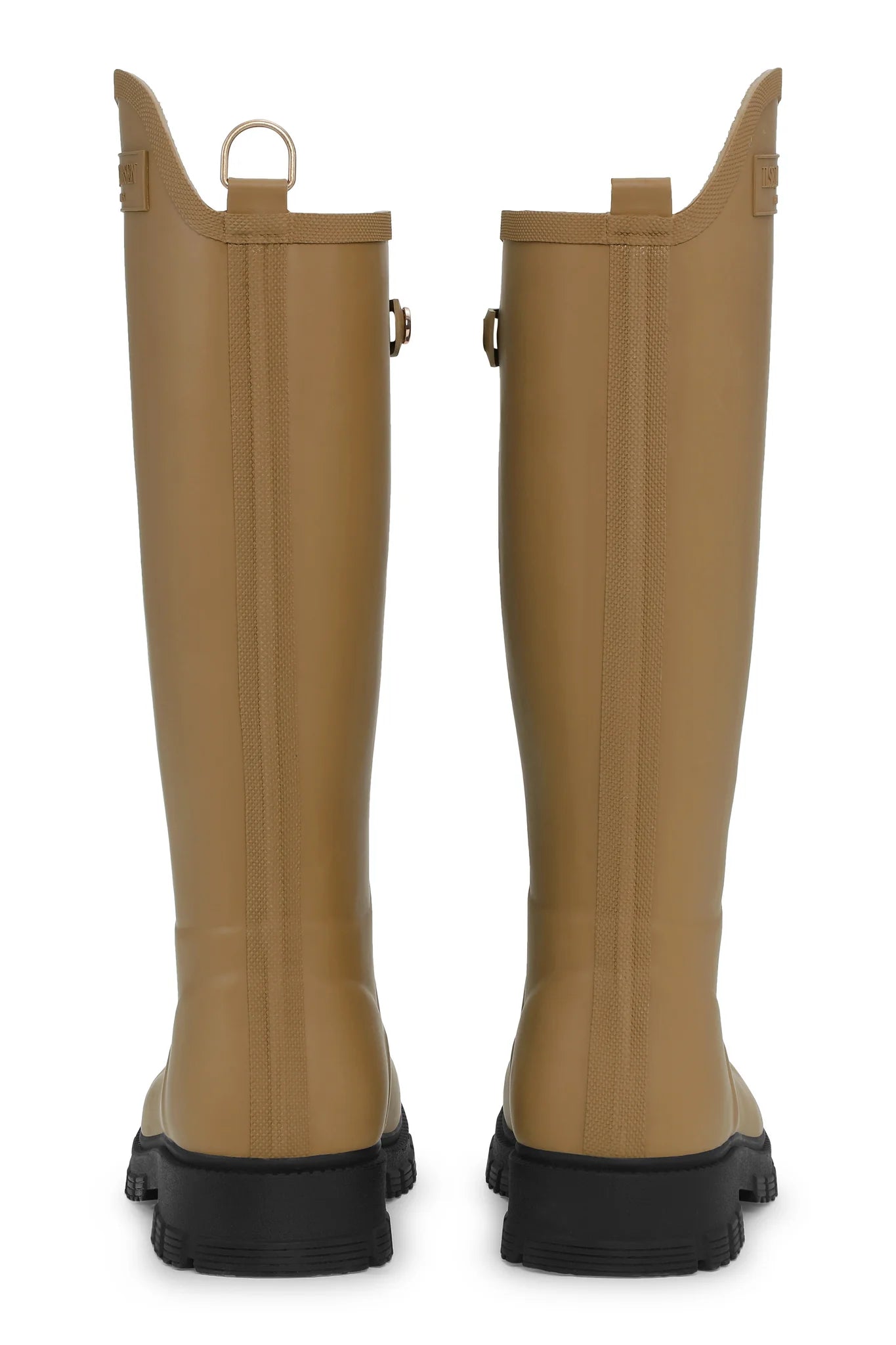 Asymmetric knee length wellingtons. A combination of style and functionality for rainy days. Featuring a decorative D-ring at center back and logo on the shaft. Elastic for easy access and a strap with logo gold buttons for decorations. The rubber sole ensures excellent traction on wet surfaces.