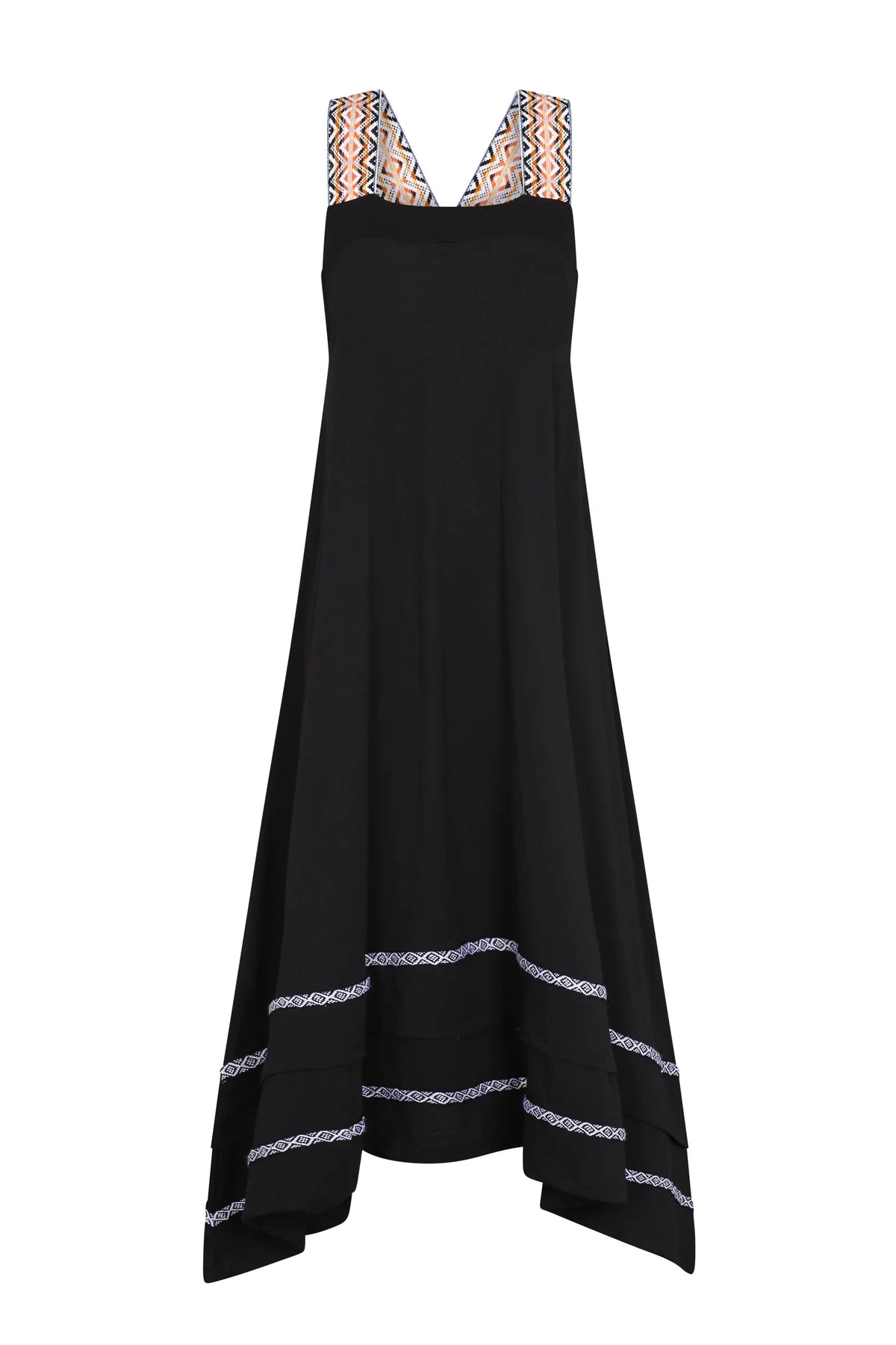 The Monochromatic St. Tropez Dress in Black by Pitsua is a flowy mid dress with a relaxed silhouette. It features a solid black body, patterned woven straps for contrast, and a tiered hem with subtle embroidered trim. Light and effortless, it has a chic bohemian feel that’s easy to wear in warm weather.
