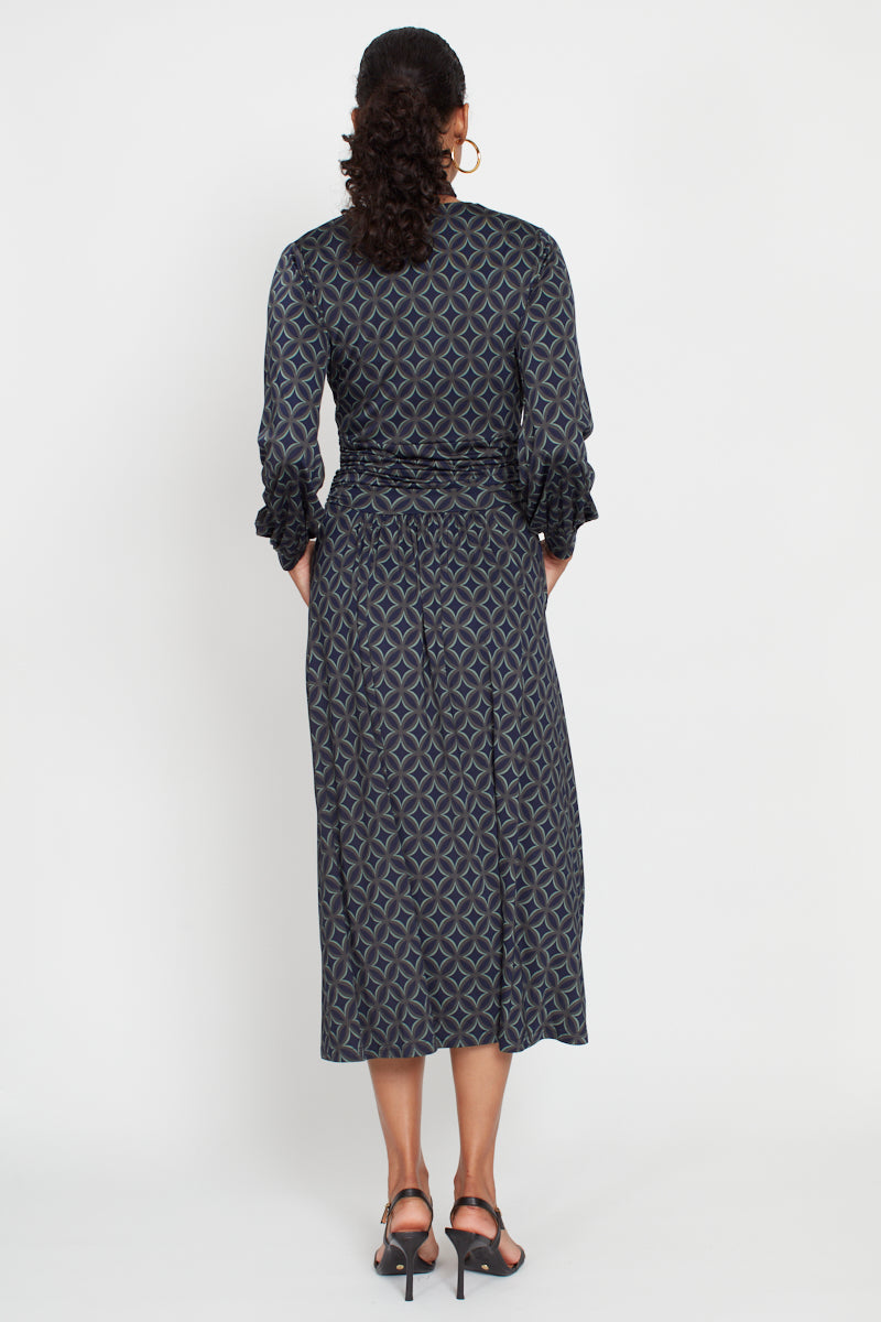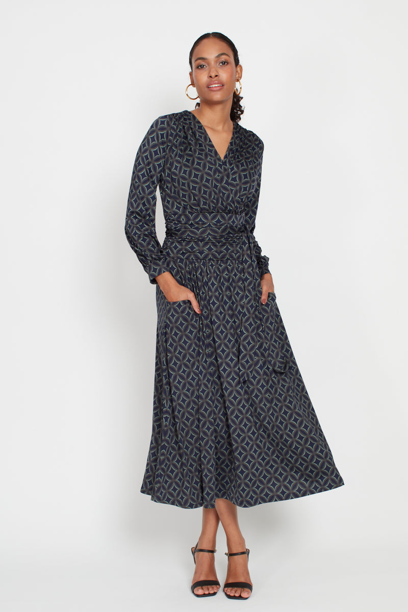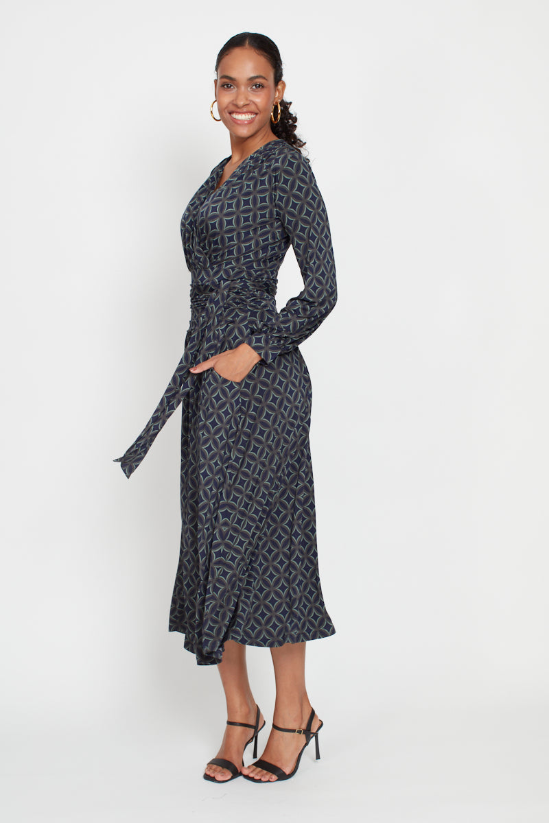 The Sharon midi dress is our signature Dress. It has a super flattering neckline, double ruched waistband for structure and support and a slightly A-line skirt that will make you feel and look amazing!