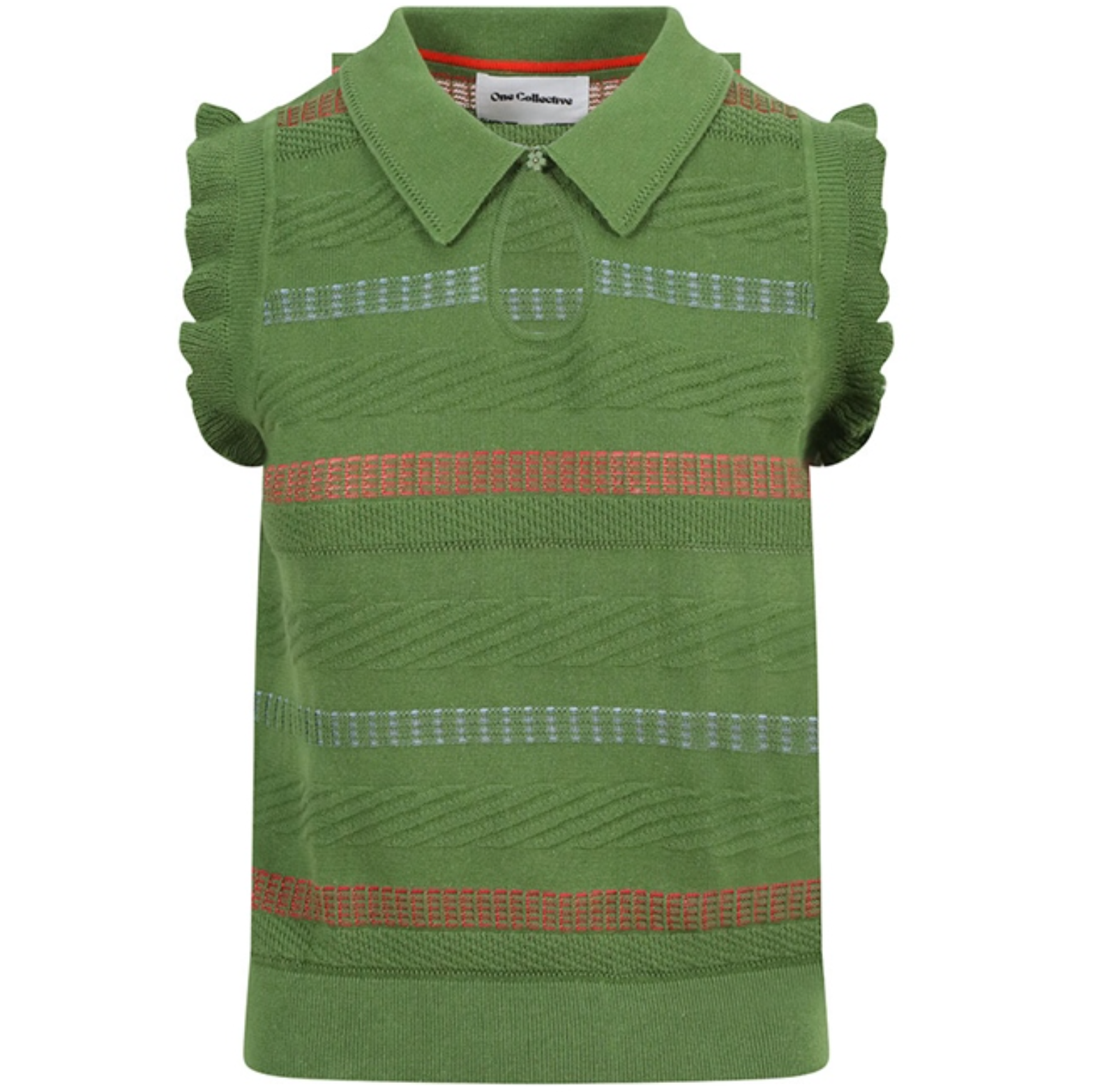 The "Montpellier" sleeveless keyhole jumper by One Collective is a chic and breezy staple for the warmer seasons. The keyhole neckline with the sweet button fastening adds a touch of elegance, while the frill at the armholes softens the look with a lovely feminine detail. The stitched stripe design brings in that fresh, modern twist that makes it stand out from your typical summer knit. It’s one of those pieces that can easily go from casual daytime to something a bit more polished depending on how you style it, tucked into a high-waisted skirt with sandals, or worn with denim cutoffs and trainers for a relaxed, weekend look. It is super wearable and flattering.