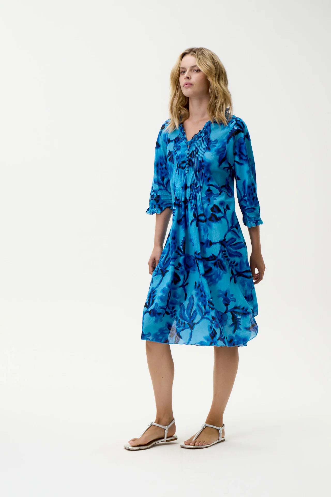 The Middy Poppy is our longest standing and most loved style. A true summer essential, the style is cut from 100% washed cotton and complements all body shapes with a flattering, looser silhouette. It’s finished with delicate raw ruffles around the neckline and sleeves and sits just below the knee.
