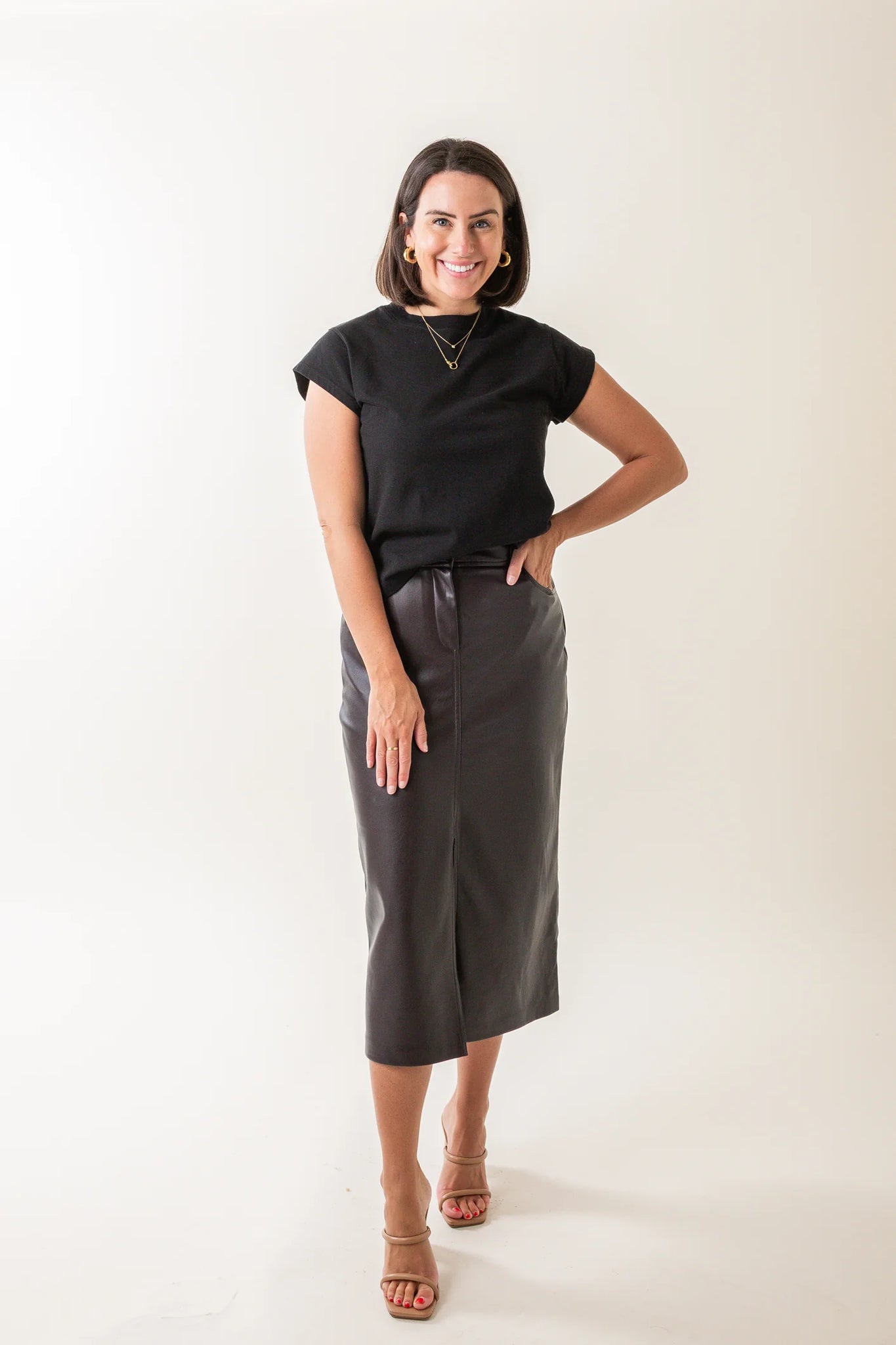 Elevate your wardrobe with the Suncoo Frida Leather Skirt, featuring a sleek straight cut and flattering high waist. Crafted with a leather effect finish, it offers a refined look complemented by a front slit for subtle allure. Practical details include a zip and hook closure, two front pockets, and belt loops, combining style with functionality for a sophisticated, modern silhouette.