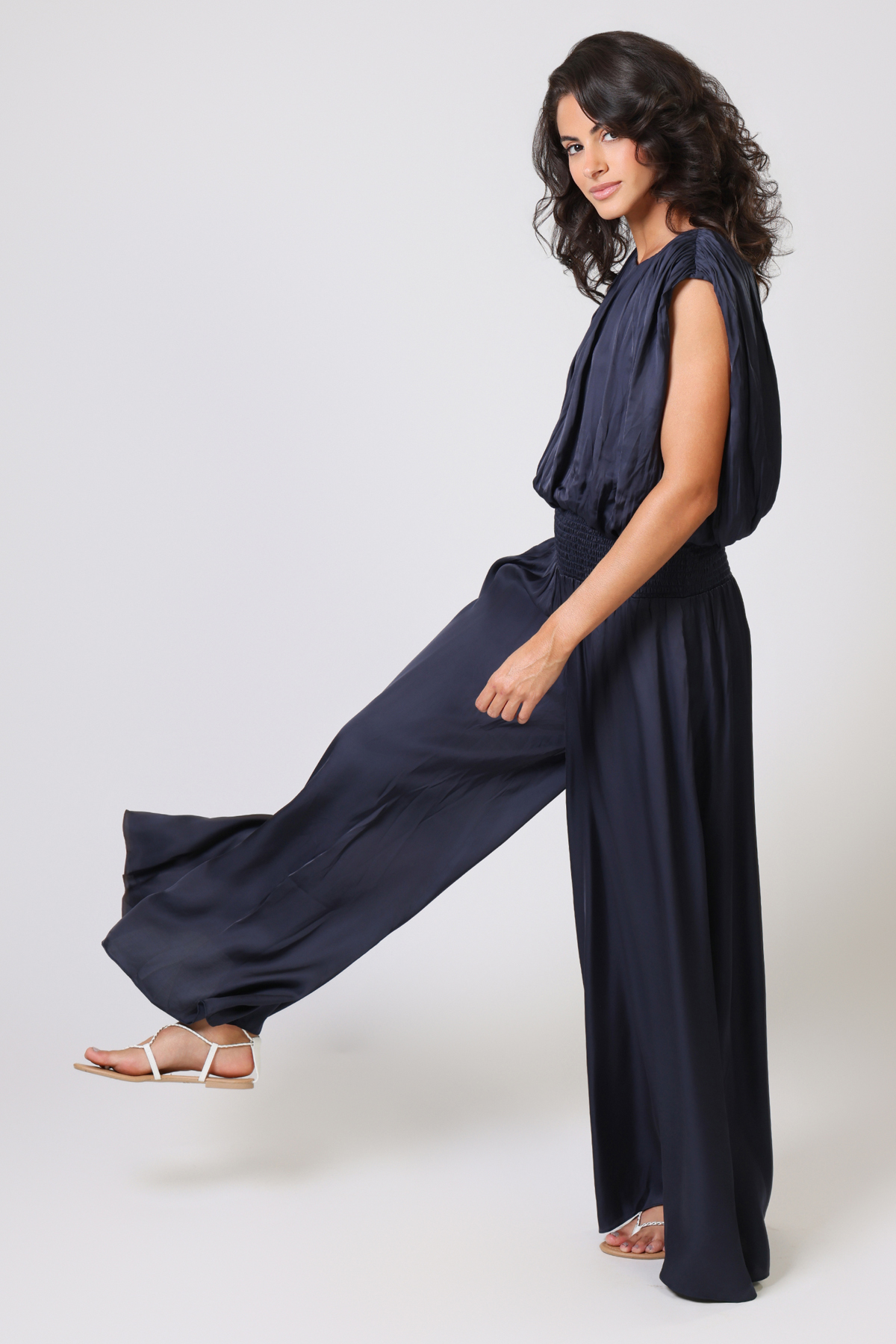 Free billowing trousers with an ultra-wide elastic waistband designed to sit low or high on the hip. Side seam pockets.