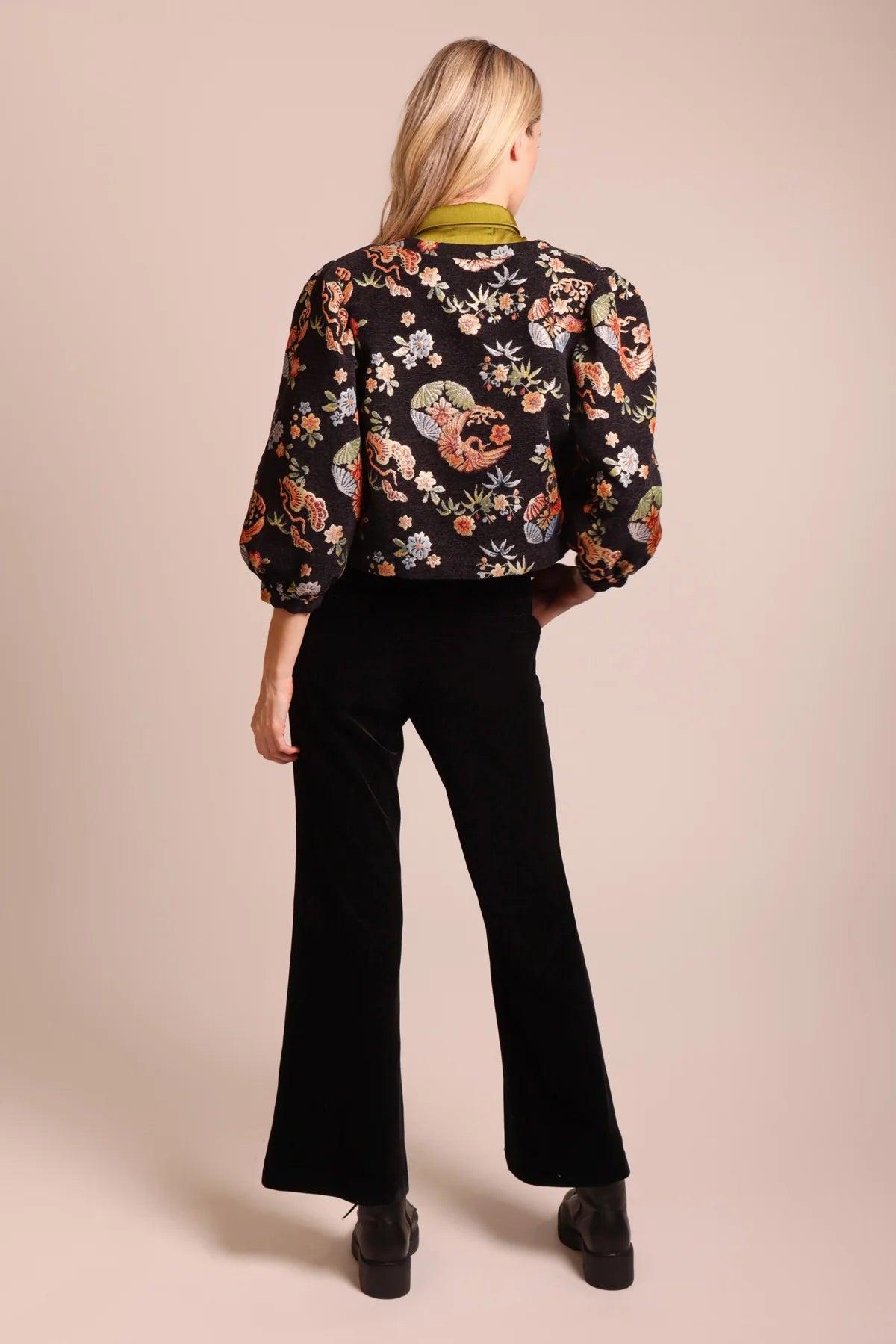 Our Paddle jacket is a savvy blend of comfort and fashion. This cropped padded jacket has a chic boxy style fit, with a round neckline and 3/4 puff sleeves with an elasticated cuff. So stunning in this black and white embroidered and sequined cotton.