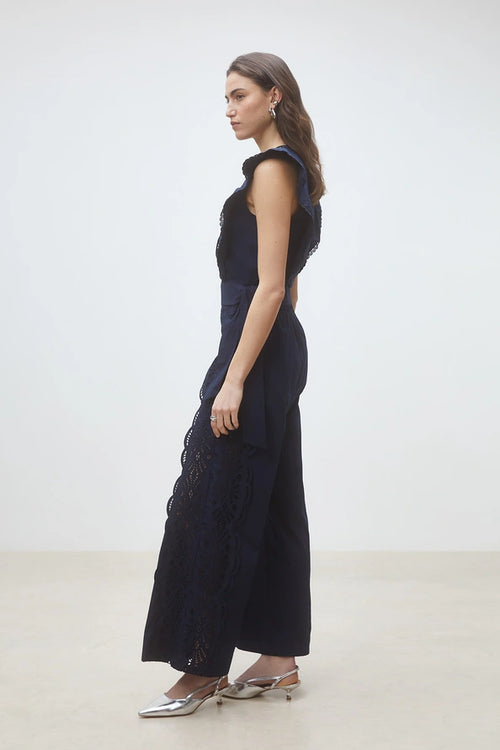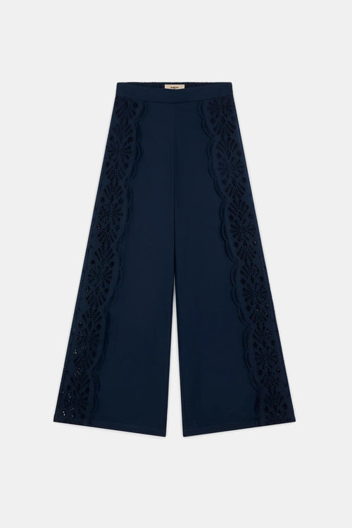 These embroidered flared pants are crafted from lightweight cotton poplin made of 100% organic cotton, offering both comfort and breathability. Designed with a flattering flared silhouette, they feature delicate tone-on-tone embroidery along both sides, adding subtle texture and elegance. The waistband includes a matching tie detail for an adjustable fit, while the elasticated back ensures added comfort and ease of wear. Effortlessly blending style and practicality, this piece is a refined addition to any wardrobe.